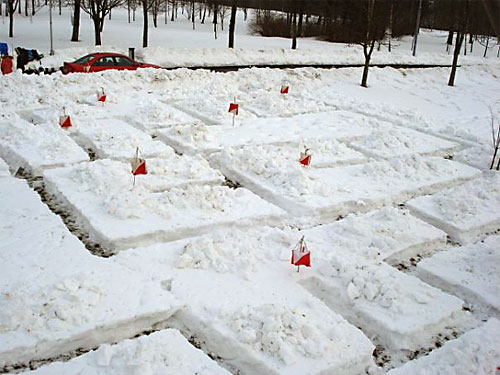 Наступило утро воскресенья. Старт был намечен на 12.00, а организаторы появились на месте старта в Коложском парке у Стелы уже в 9.00 утра! За 3 часа нам предстояло вырыть в снегу лабиринт в виде квадрата со стороной 20 метров и при этом в строгом соответствии с заранее составленной картой. Для начала было выбрано открытое пространство поближе к асфальтной дорожке, ведь по условиям тренировки, участники должны были сначала пробежать кросс по кругу 1320м, и только затем лабиринт, и так 3 раза! Самой трудной, как оказалось, была задача откопать проходы к старту и финишу, ведь копать пришлось через обочину тротуара, как раз там, куда добросовестные дворники сбрасывали снег с дорожки. За всю зиму здесь образовался 1,5-метровый сугроб. Периметр лабиринта выкопали почти за час, оставалось дело за малым - внутренние коридоры и 2 часа времени! Как оказалось впоследствии, мы не зря делали засечки на снегу, когда копали периметр - это значительно ускорило работу при выверке коридоров.