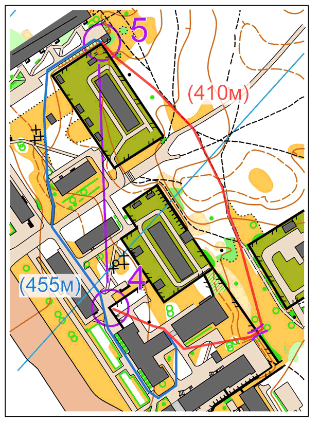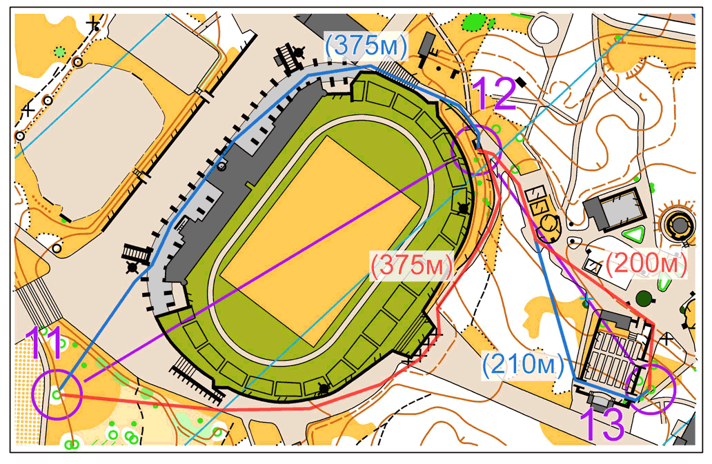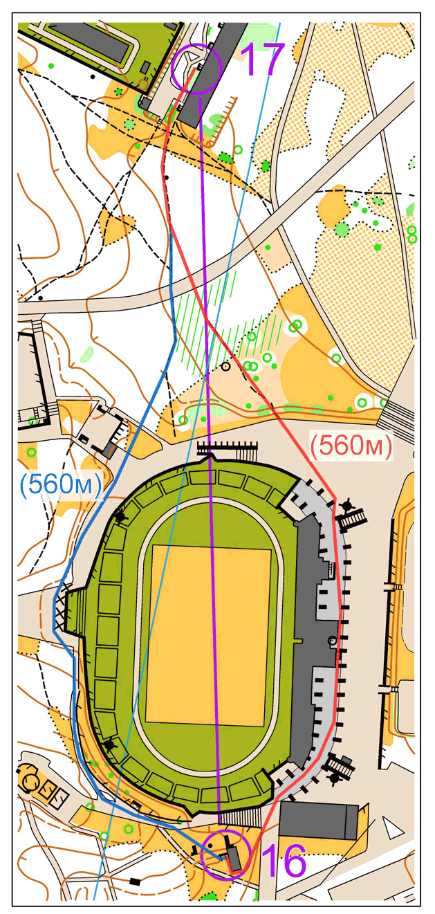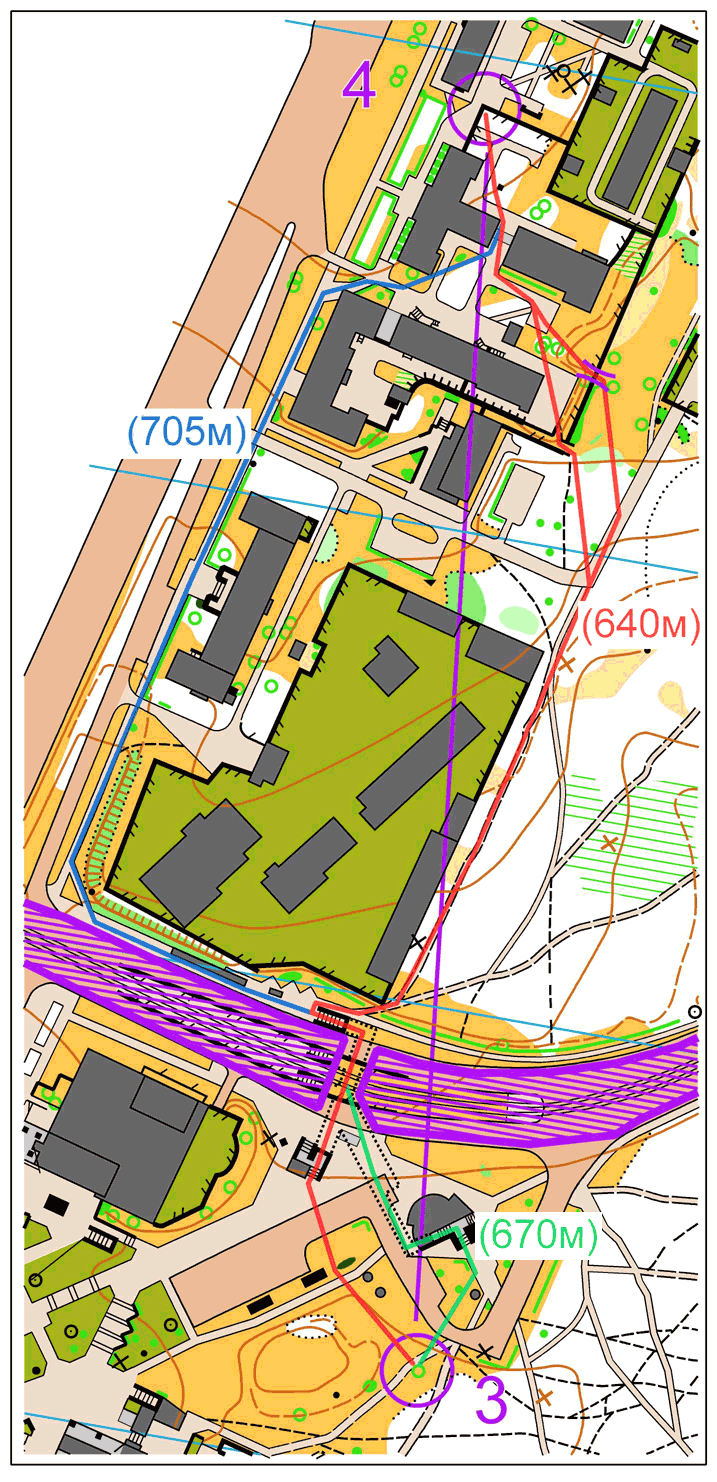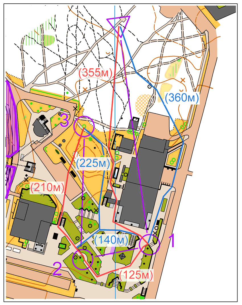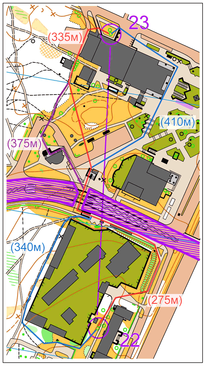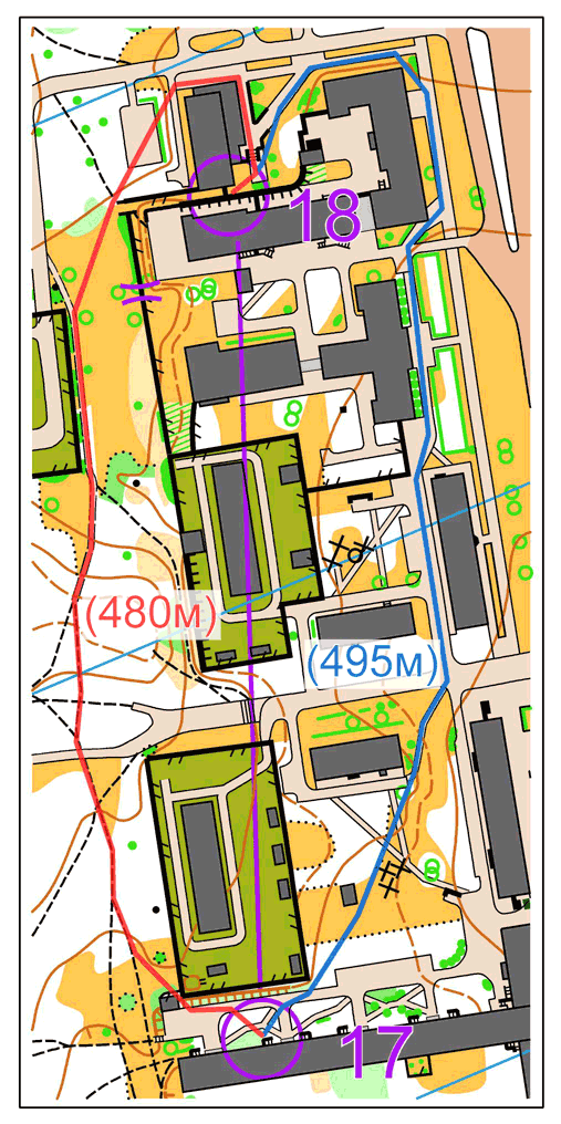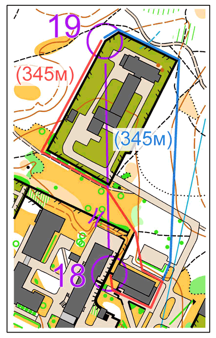 Перегон можно разделить на две части: до перехода и после. И если до перехода всё однозначно (обратный ход на левом варианте сильно увеличивает длину варианта), то далее приходится подумать. Нужно было определиться, с какой стороны лучше обегать здание, и соответственно через какой переход в таком случае выбегать.
