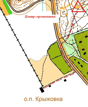 Район соревнований ограничен с запада - железной дорогой, юга и востока - асфальтированной дорогой, севера - четких ограничений нет. В случае потери ориентировки выходить на запад до железной дороги и далее на юг до станции "Крыжовка", от станции к центру соревнований по маркировке.