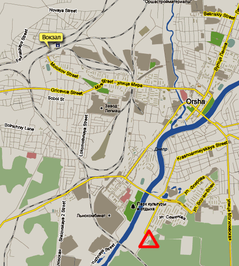 Проезд автобусами № 1, 2 до ост. "Первый микрорайон", далее пешком по улице Заднепровская к Филиалу гостиницы "Орша" (Профилакторий Льнокомбината).