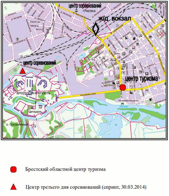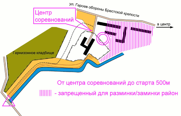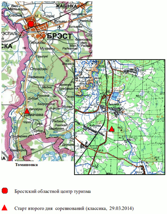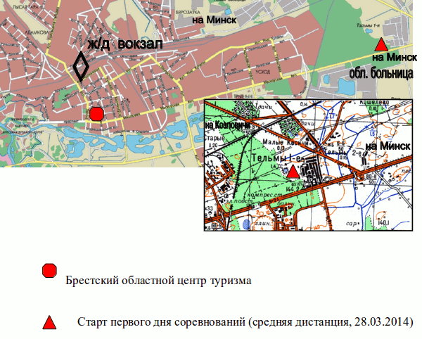 Район соревнований с юга ограничен трассой Брест-Минск, с запада-железной дорогой, с севера и востока – полем и частными застройками.