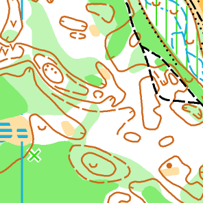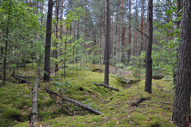 Местность слабопересеченная, общий перепад высот 25 метров, на склоне преимущественно 10-15 метров. Насыщенный водноэрозионный микрорельеф, множество окопов, траншей и воронок, небольшой участок луговой поймы. Лес смешанный, преимущественно хвойный, хорошей и средней проходимости, участки лиственного подлеска, сеть дорог и просек. Грунт твердый. Болот практически нет. Крапивы очень мало.
