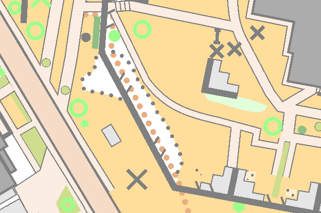 Городской парк в одной части карты и городская застройка в другой, открытая на 85% территория, плотная сеть дорог и тропинок.