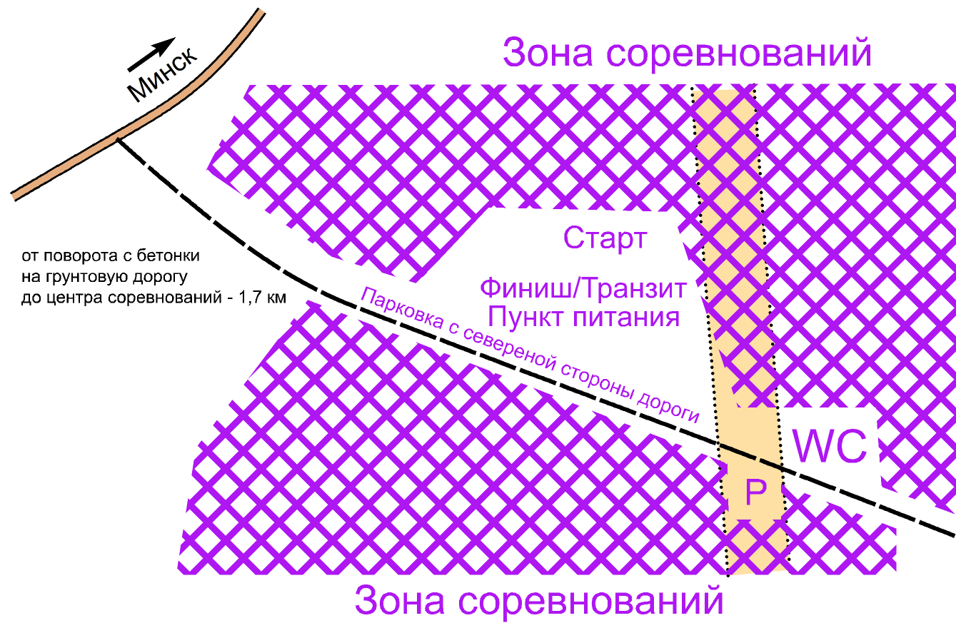 Проезд к центру соревнований: с трассы Р58 Минск-Мядель в районе д. Малые Бесяды повернуть на запад на бетонную дорогу Н-8965, через 4 км свернуть налево на грунтовую дорогу, далее 1,7 км до центра соревнований.