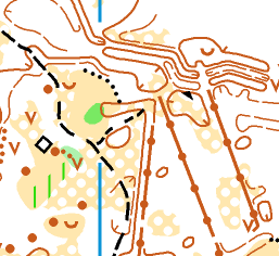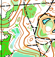 Местность: среднепересечённая, с перепадами высот на склоне до 15 м, лес смешанных пород преимущественно хорошей проходимости, сеть дорог и просек развита хорошо. Грунт твердый, местами песчаный. По всей площади карты встречаются поваленные ураганом отдельные деревья, не указанные на карте. Ведется санитарная рубка леса.