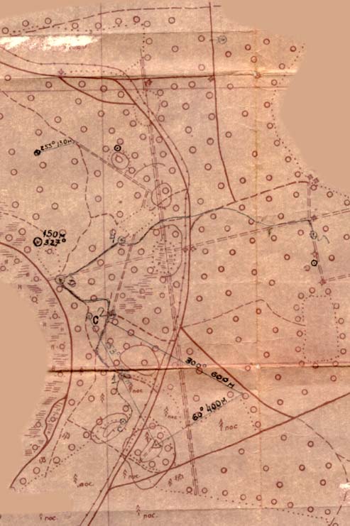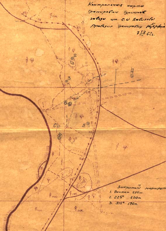 На следующей карте, Вы уже видите, появилась более густая сеть дорог, рельеф. Это контрольная карта тренировки туристов завода им. С. Вавилова, которая прошла 7 сентября 1962 г. На карте карандашом нанесен закрытый маршрут и его описание.