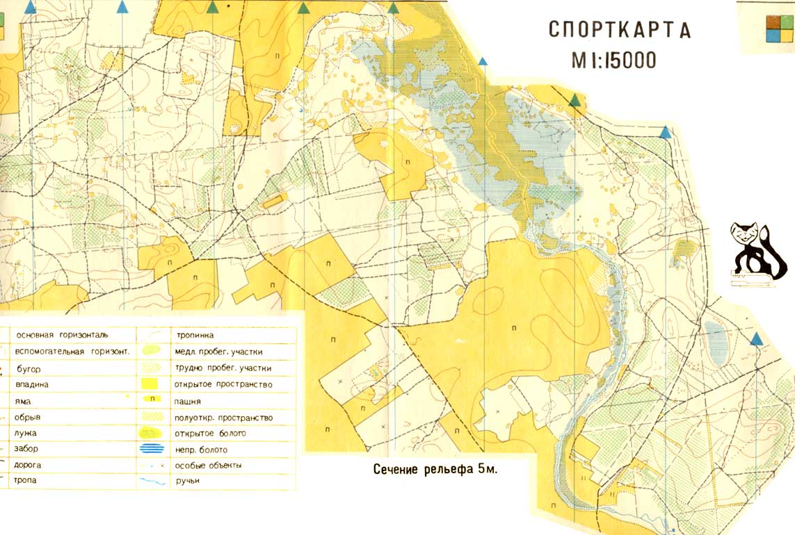 Следующая карта имеет уже гидрографию и рельеф. Эта карта подготовлена примерно в 1965 г. На ней проходил шуточный старт. Вот небольшое описание "легенд КП" с этих стартов: