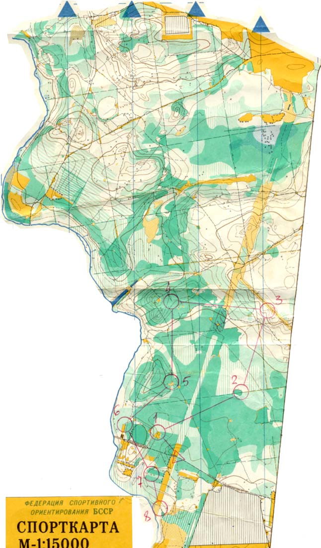 Эта карта использовалась на первых соревнованиях по спортивному ориентированию в Беларуси - первенстве Минского электротехнического завода. Соревнования провёл Гурин Михаил Викторович. Скорее всего, выкопировку с секретной топографической карты сделал Фещенко. На севере карты уже несуществующая деревня Водопой. Масштаб 1:25000. Рельеф на карте не показан. На карте нанесена дистанция первых Минских областных соревнований, которые проводились примерно в 1962 году.