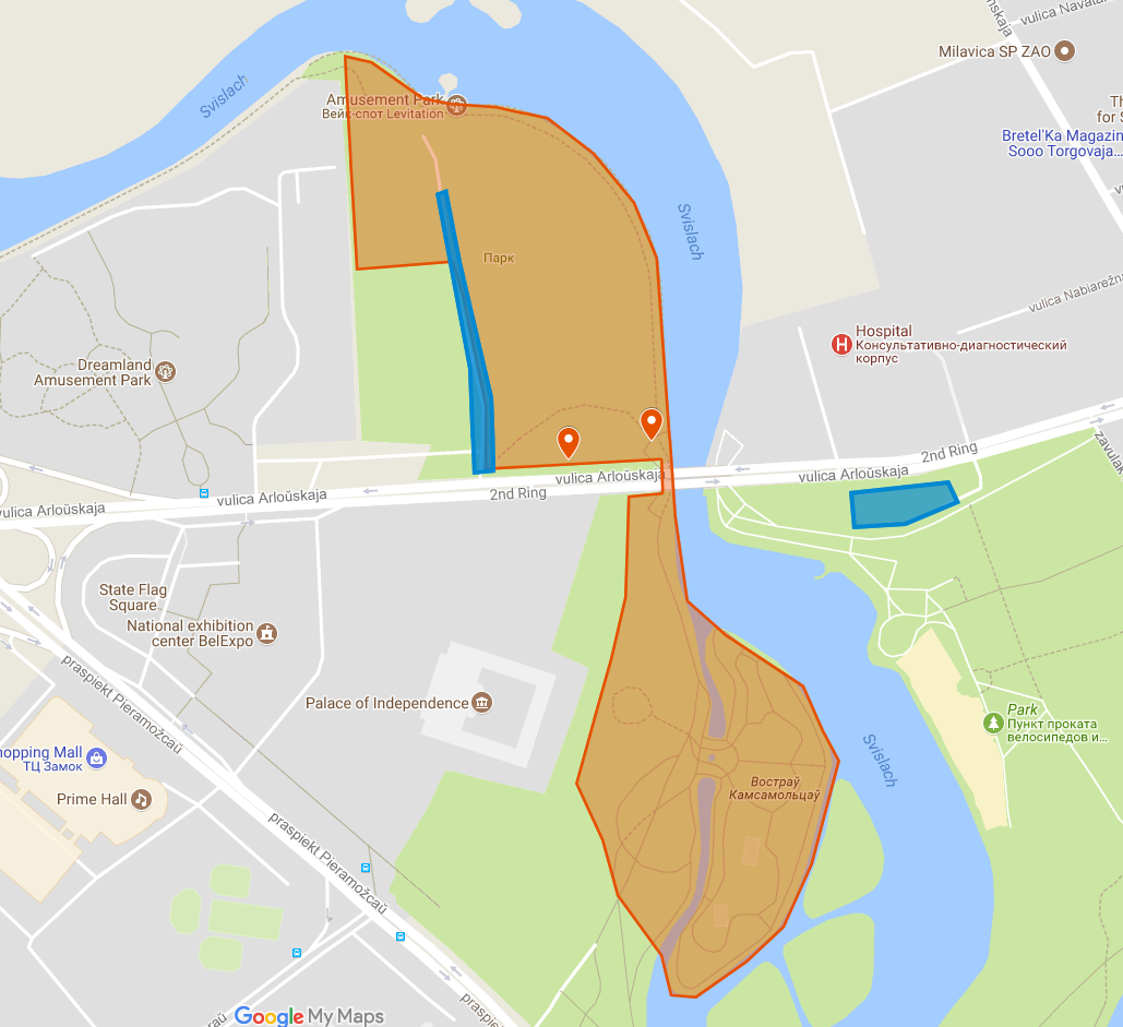 Городская велодорожка с очень интенсивным движением велосипедистов, дистанции МЖ 16-21 пересекают ее один раз. Крутой бетонный берег реки Свислочь (пунктов в опасной близости нет), проезд от ул. Орловской к реке Свислочь со слабоинтенсивным движением. На дистанции будут находиться судьи-контролеры, руководствоваться их указаниями при пересечении велодорожки и проезжих частей.