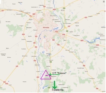 Поворот с автодороги «Могилев – Гомель» на садовое товарищество «Химик».