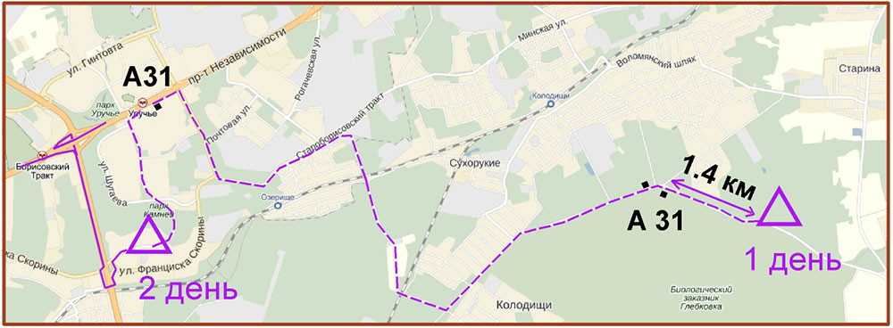 От остановки «Поворот на Колодищи» автобуса №31 до центра соревнований 1.4 км.