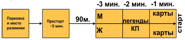 Пре-старт - минус 3 минуты. Стартовый интервал 2 минуты.