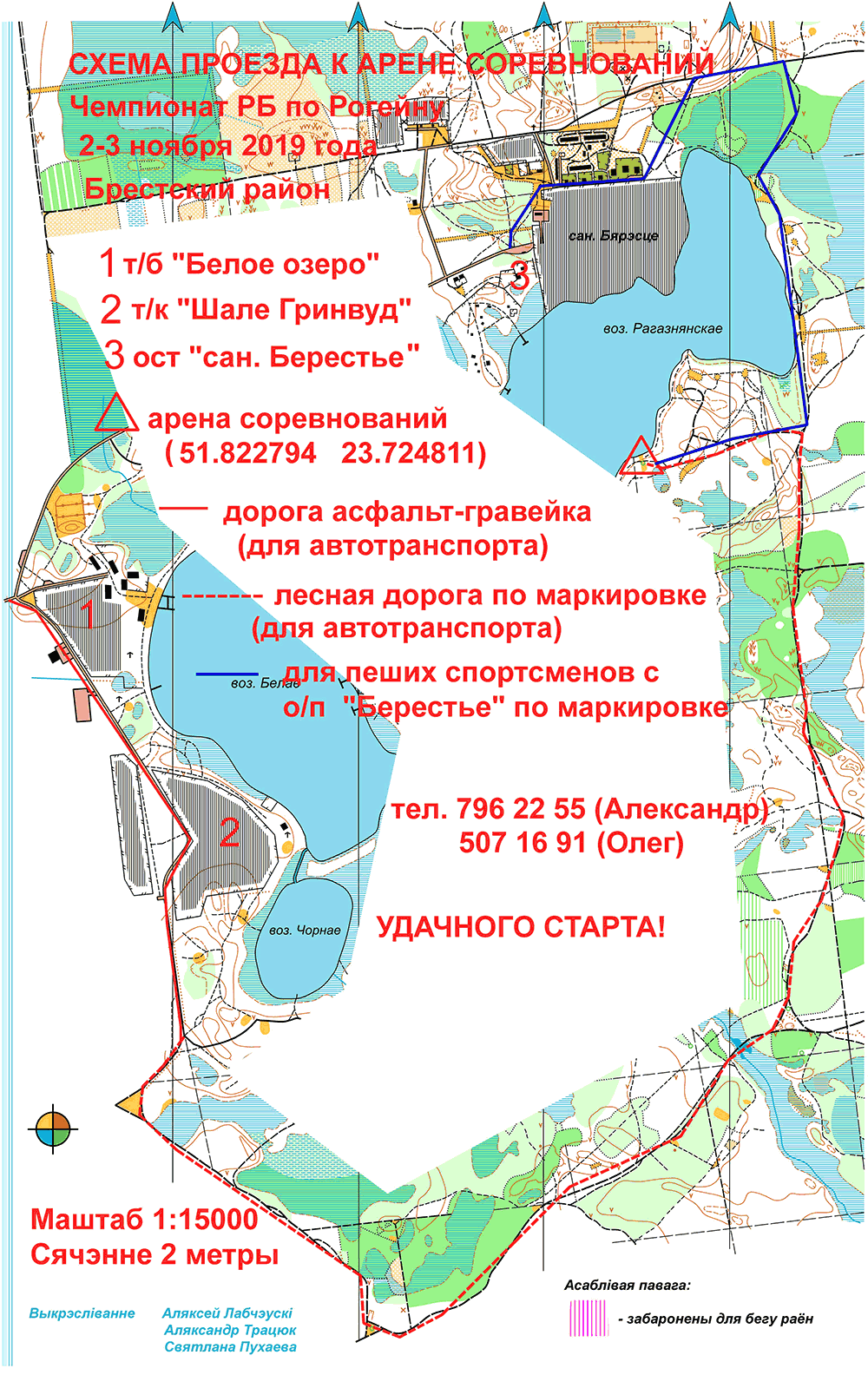 Центр соревнований будет расположен вблизи оз.Белое – оз.Рогознянское. Расстояние от Бреста до центра соревнований около 40 км (по трассе Брест – Томашовка). Точные координаты центра соревнований и схема проезда будут сообщены дополнительно.