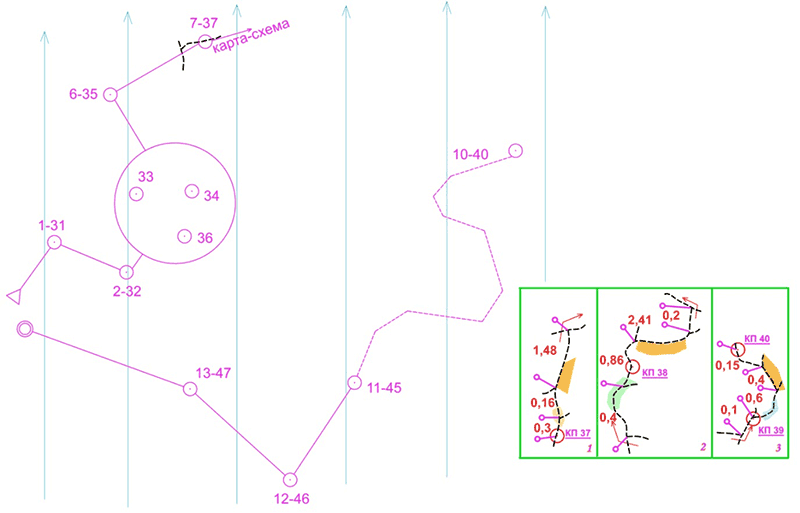 Карта-схема начинается и заканчивается на контрольных пунктах. Эти контрольные пункты дублируются в спортивной карте и в карте-схеме.