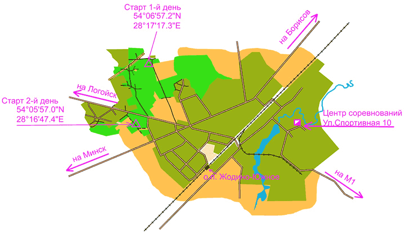 Район соревнований ограничен с востока г.Жодино, с севера автомобильная дорога с интенсивным движением, с юга полем, с запада посёлком Новые Грядки. Аварийный азимут на север на автодорогу, а далее на восток до города Жодино.