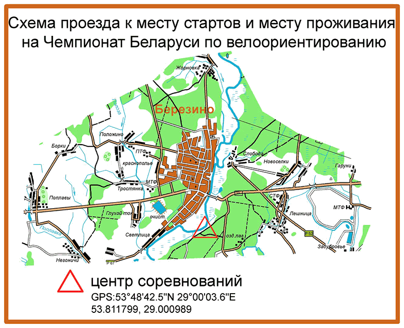 Координаты центра соревнований: 53°48'42.5"N 29°00'03.6"E 53.811799, 29.000989, Google Maps.