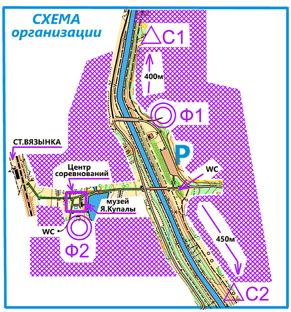 Второй день (спринт для М/Ж 12-20, средняя для М/Ж 21-80) пройдёт на местности вблизи музея им.Янки Купалы, умеренно пересечённая, большинство форм рельефа искусственного происхождения с многочисленными промоинами, вековыми дубами уникальных размеров, инженерными водостоками с достаточно крутыми склонами. Расположение старта с левой стороны водного канала, а финиша с правой – позволило впервые использовать не только пешеходный мост для перехода через канал, но и переход с южной стороны карты. Смотри схему ниже.